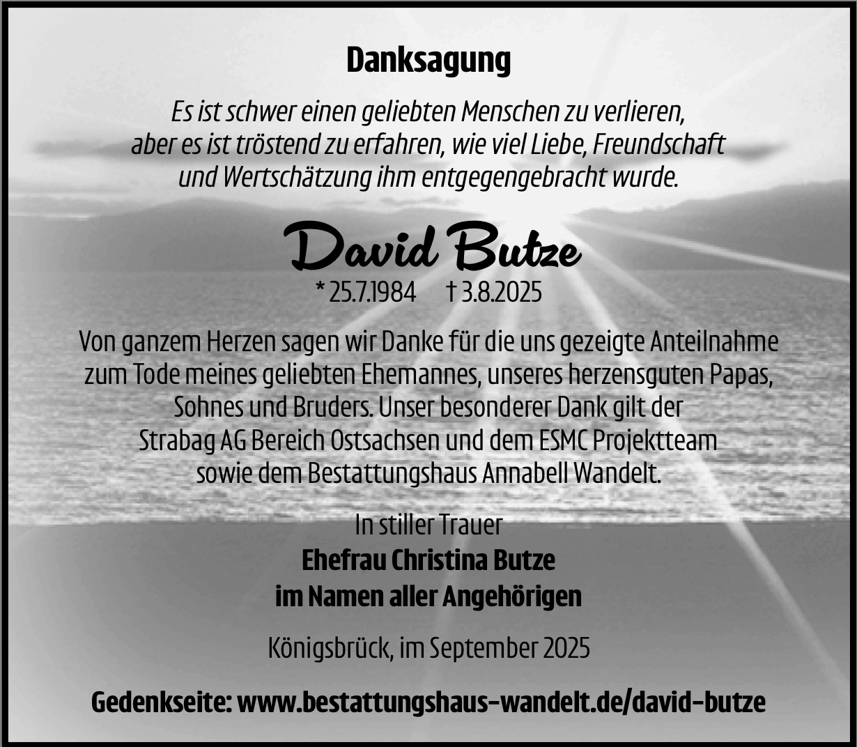 Wir begleiten David auf seinem letzten Weg am Freitag, dem 22. August 2025 um 13.00 Uhr in der Trauerfeierhalle Königsbrück.